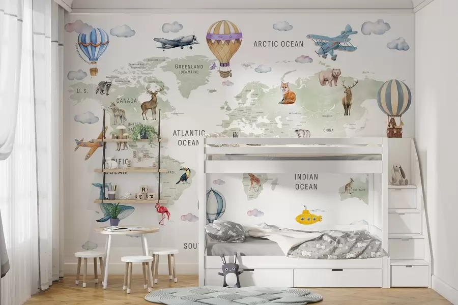 - Wall murals Children's map of the world - world map wallpaper mural is an ornament dominated by bright colours. It is not only eye-catching decoration, but also has educational value. The map features icons of aeroplanes, characteristic animals, etc. Thanks to this, the map will be perfect as a kids wall murals, but also a kindergarten or even a nursery,