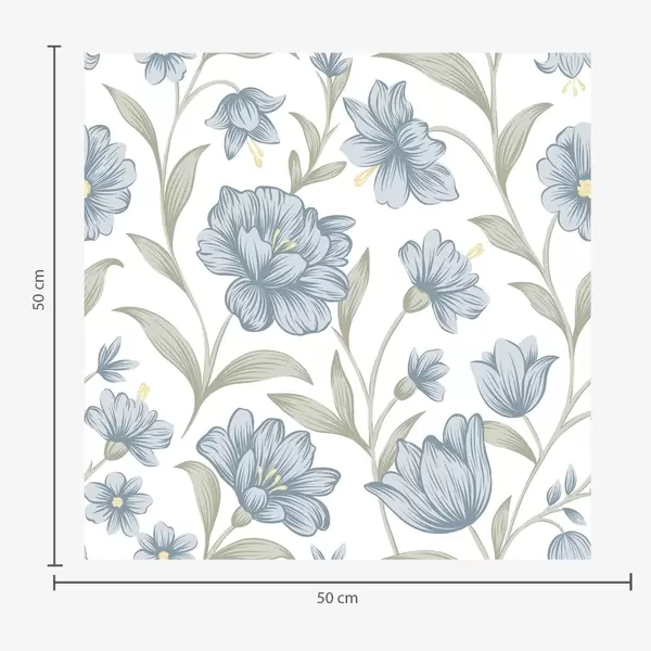 Wallpaper Dusty blue flowers with olive leaves on white a00780