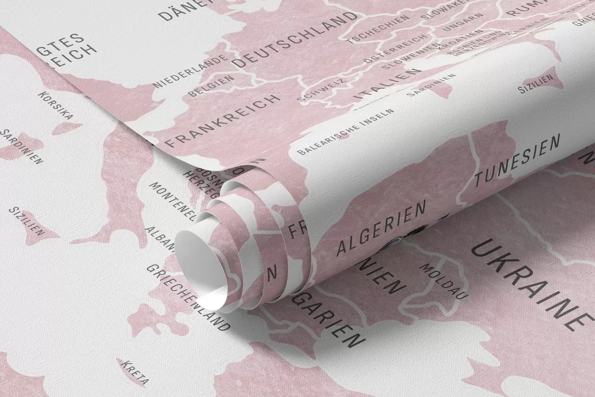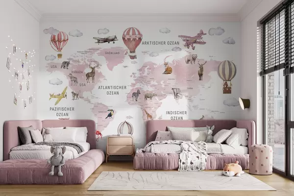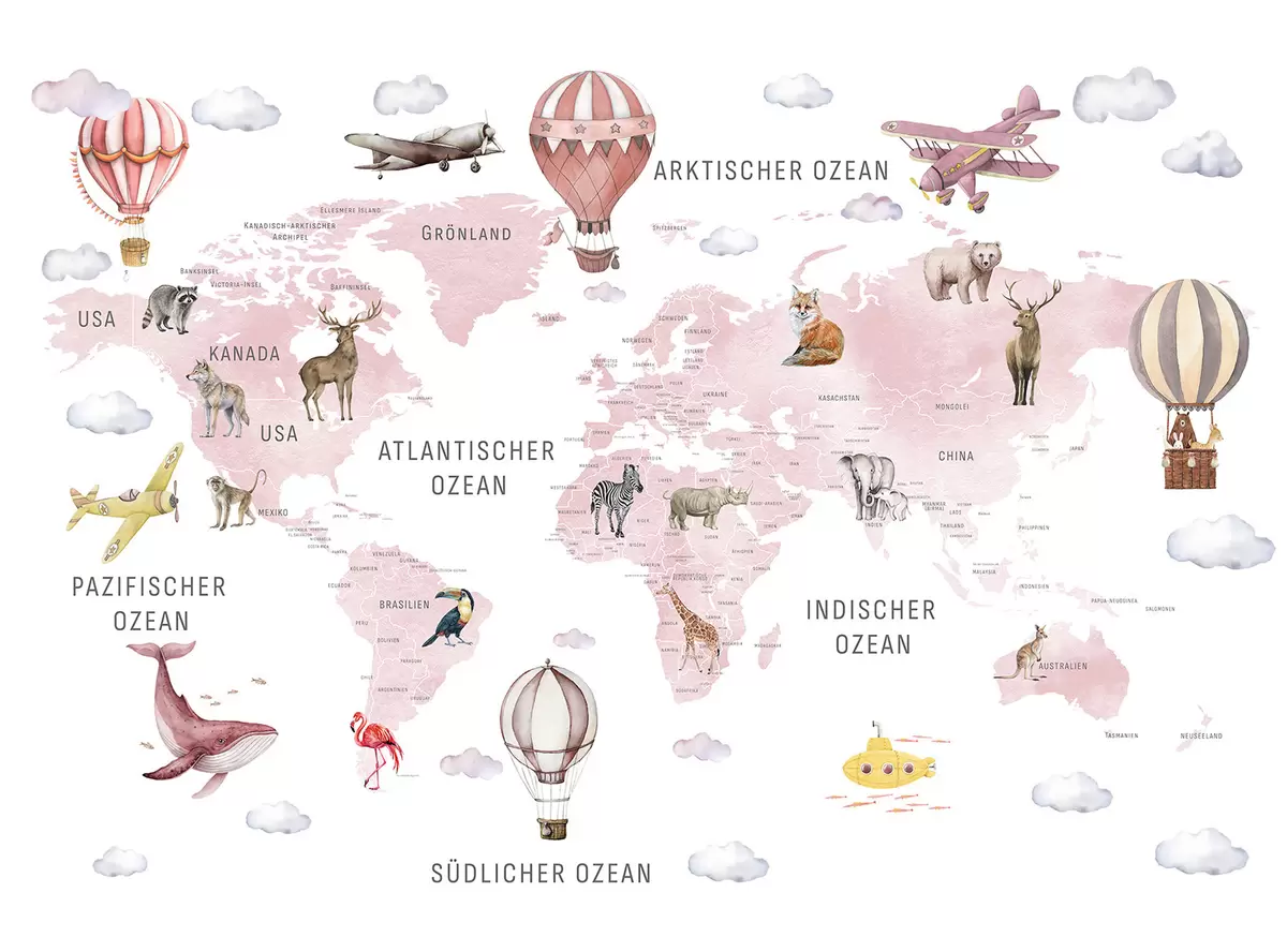 Wall murals Children's map in watercolour style with animals and hot air balloons. German language. Pink colour. Nr. c00001dev3