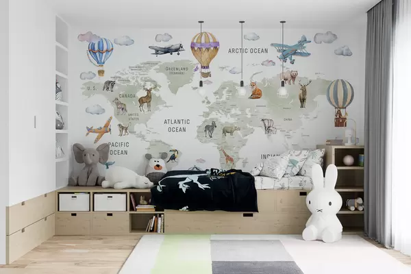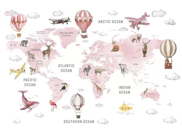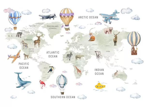 Wall murals Children's map in watercolour style with animals and hot air balloons. English language. Green colour. Nr. c00001en