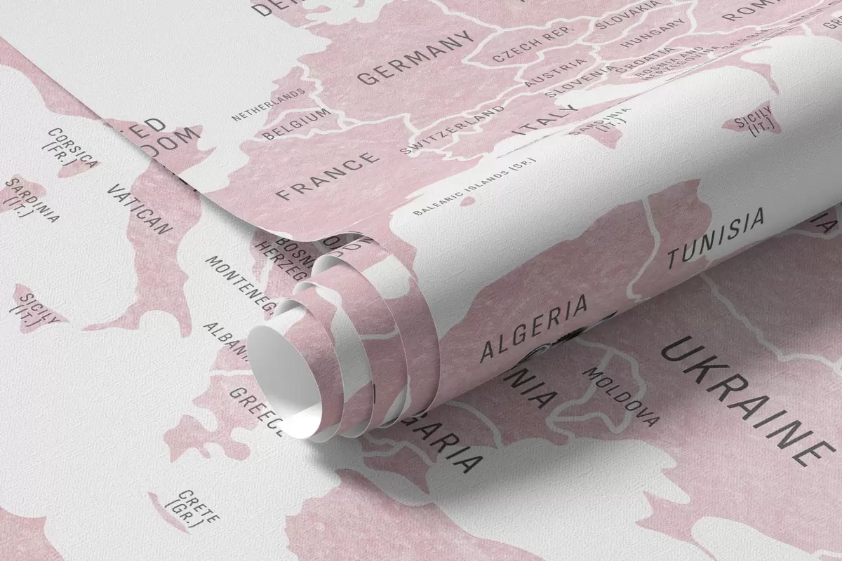 Wall murals Children's map in watercolour style with animals and hot air balloons. English language. Pink colour. Nr. c00001env3