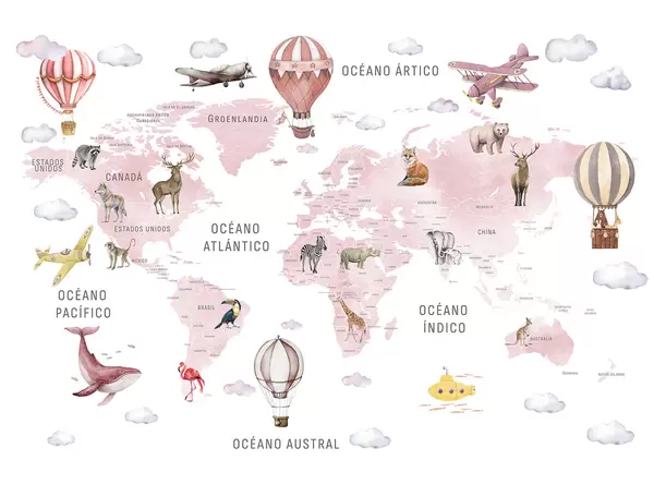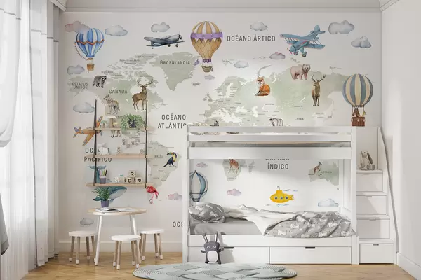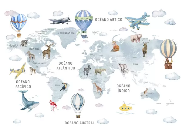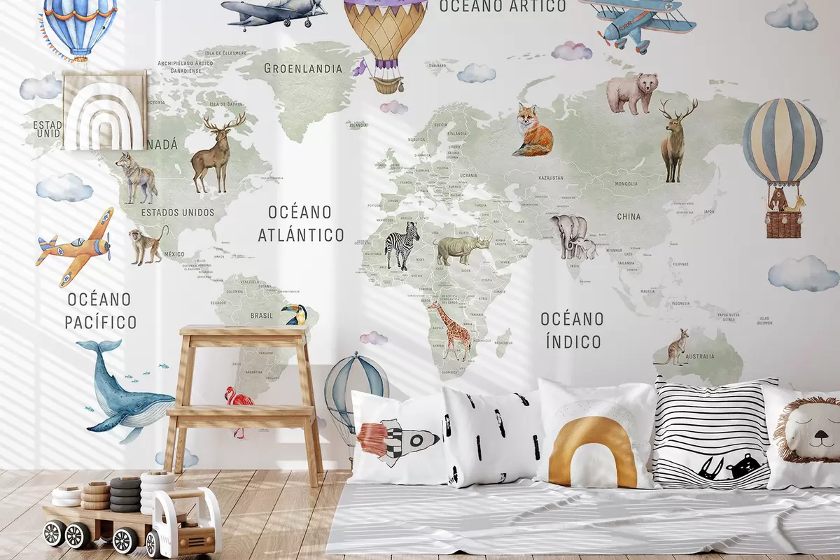 Wall murals Children's map in watercolour style with animals and hot air balloons. Spanish language. Green colour. Nr. c00001es