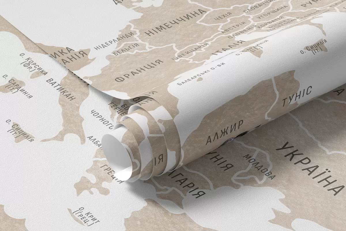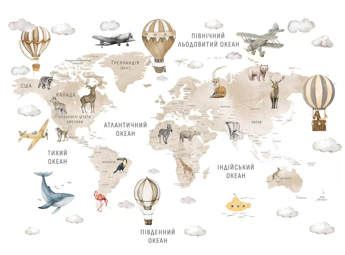 Wall murals Children's map in watercolour style with animals and hot air balloons. Ukrainian language. Beige colour. Nr. c00001ukv2