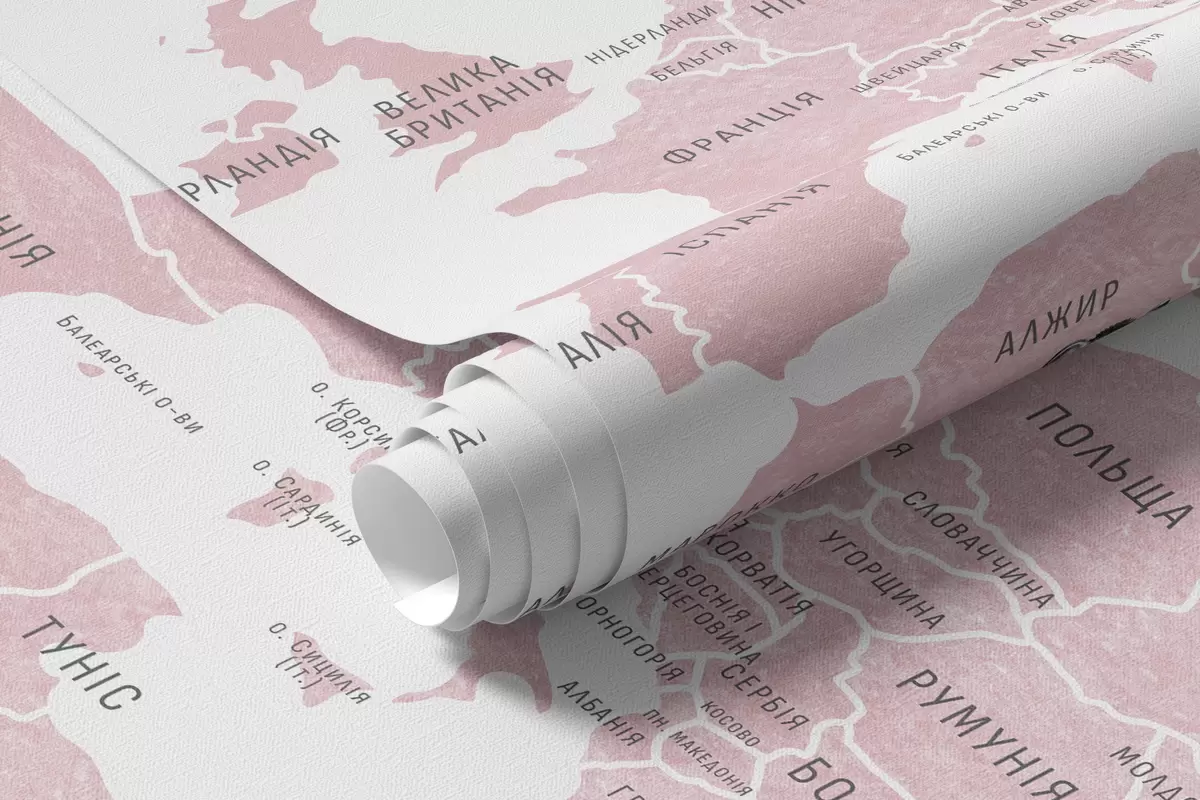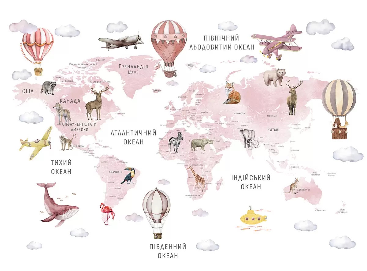 Wall murals Children's map in watercolour style with animals and hot air balloons. Ukrainian language. Pink colour. Nr. c00001ukv3