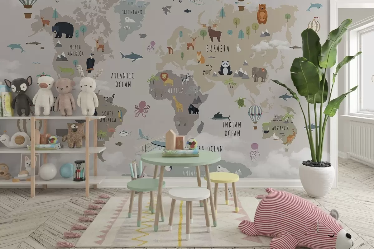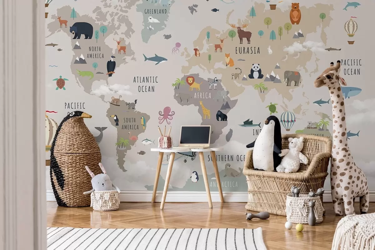 Wall murals Children's world map with animals and hot air balloons. English language Nr. c00002en