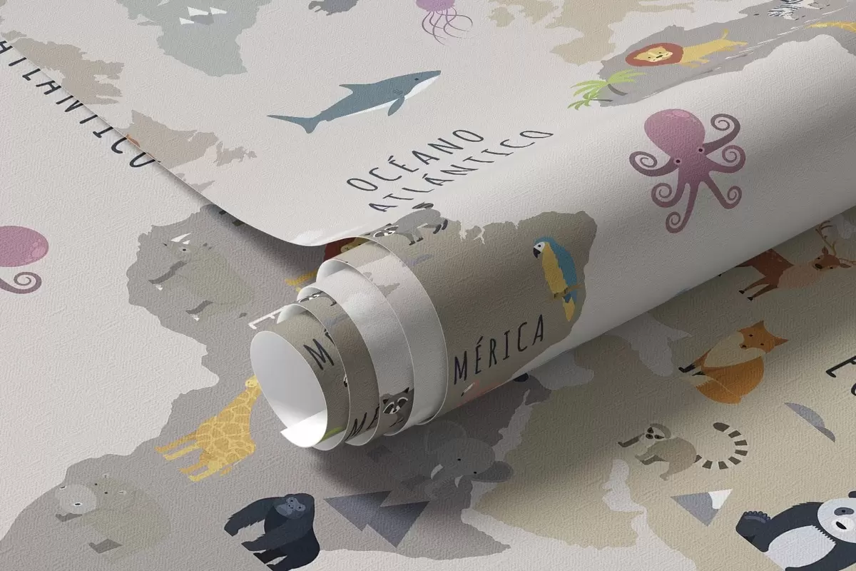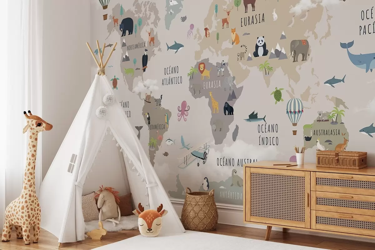 Wall murals Children's world map with animals and hot air balloons. Spanish language Nr. c00002es