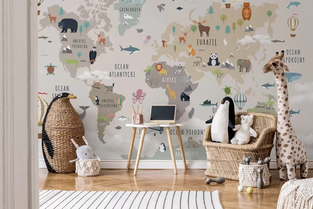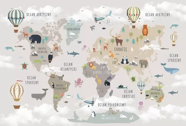 Wall murals Children's world map with animals and hot air balloons. Polish language Nr. c00002pl