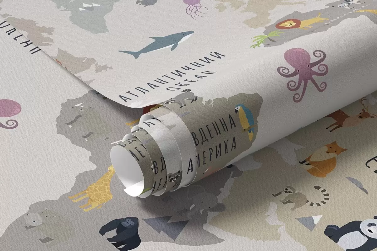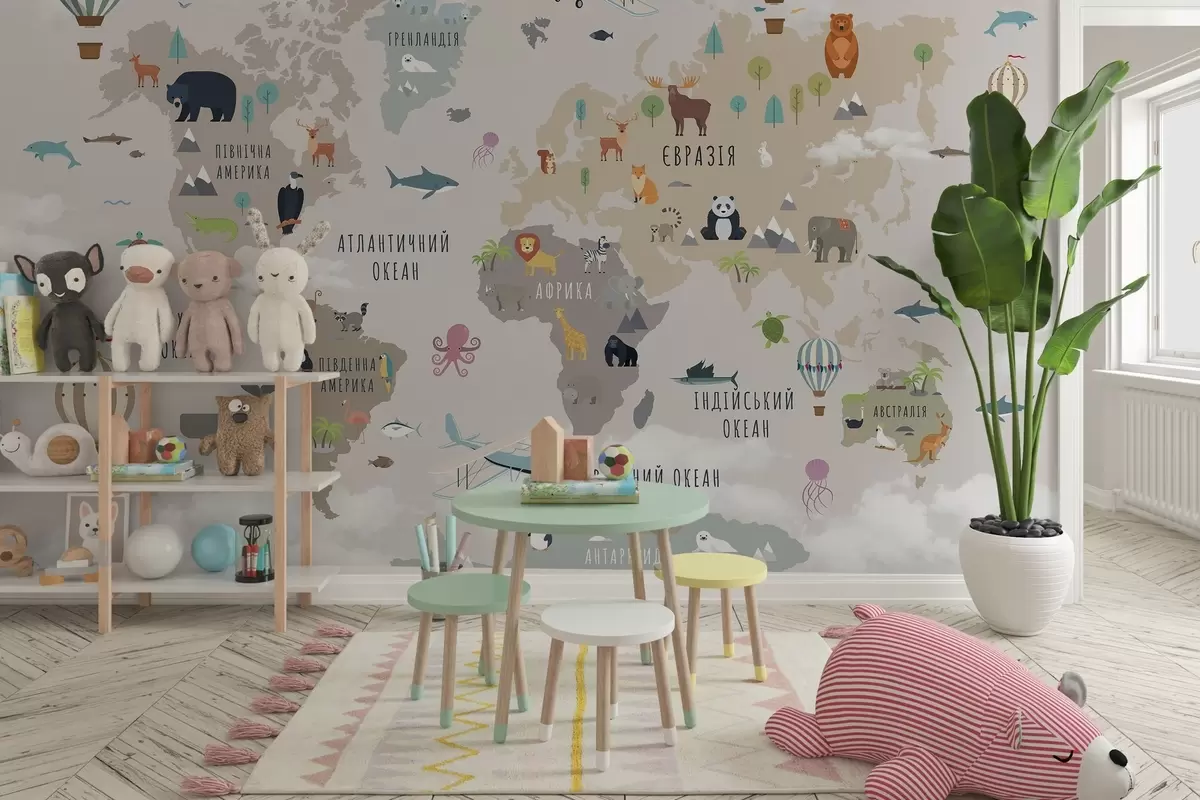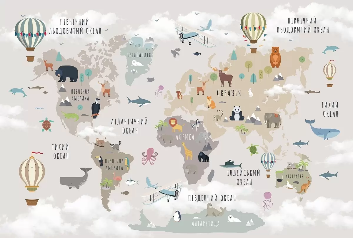 Wall murals Children's world map with animals and hot air balloons. Ukrainian language Nr. c00002uk