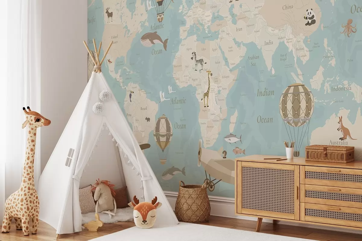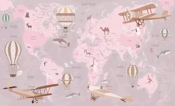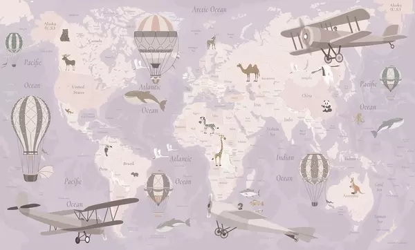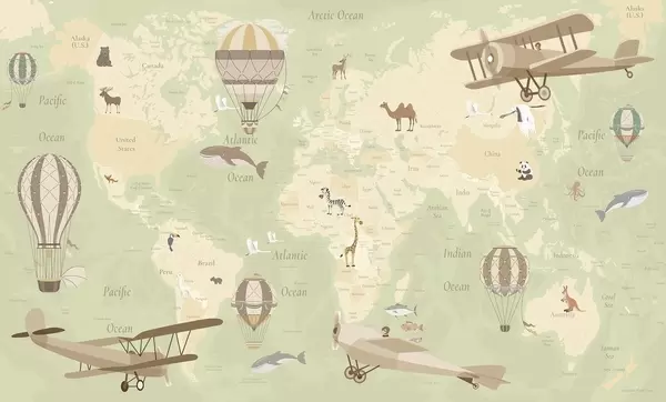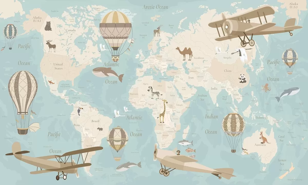 Wall murals Children's world map with animals, airplanes, and hot air balloons. English language. Blue color Nr. c00003env1