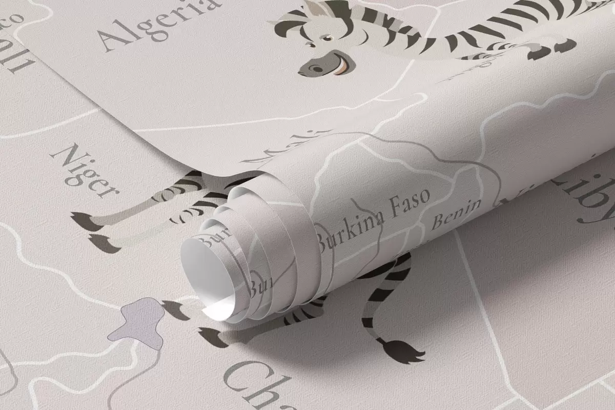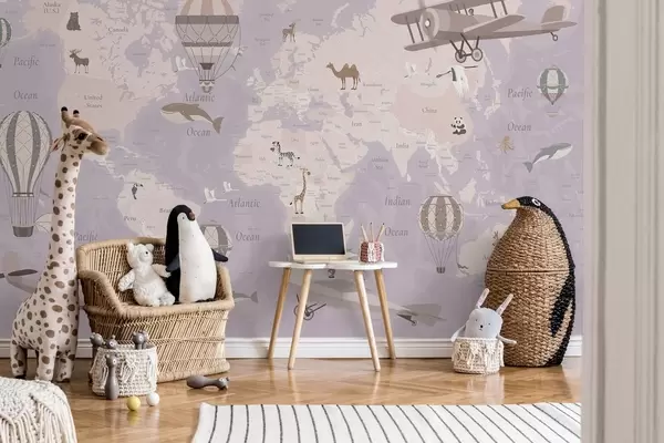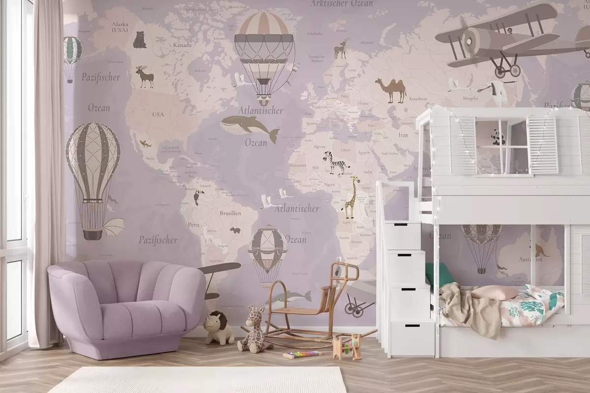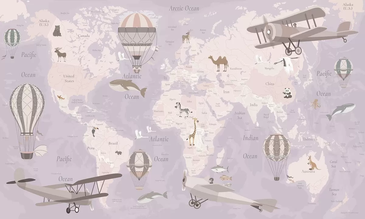 Wall murals Children's world map with animals, airplanes, and hot air balloons. English language. Purple color Nr. c00003env4