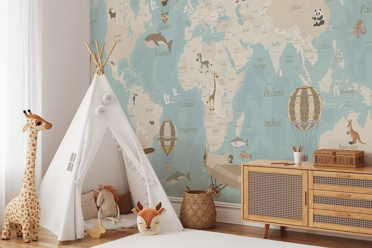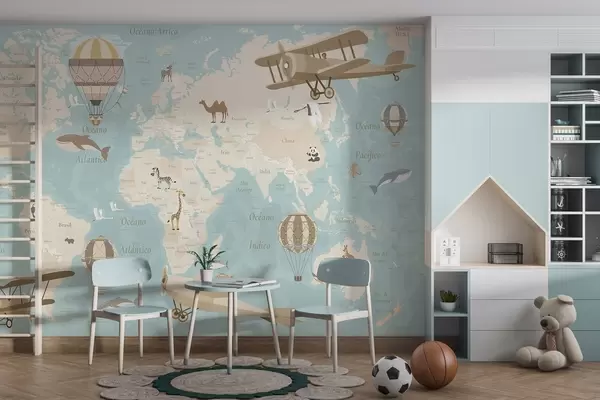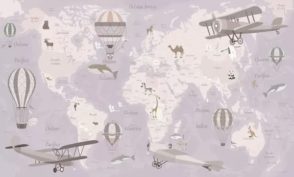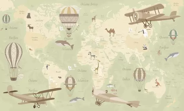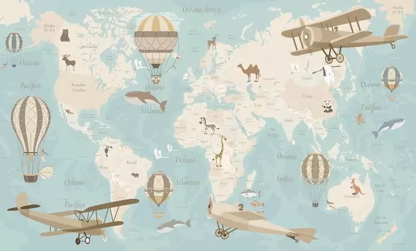 Wall murals Children's world map with animals, airplanes, and hot air balloons. Spanish language. Blue color Nr. c00003esv1