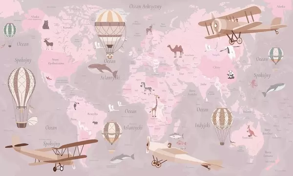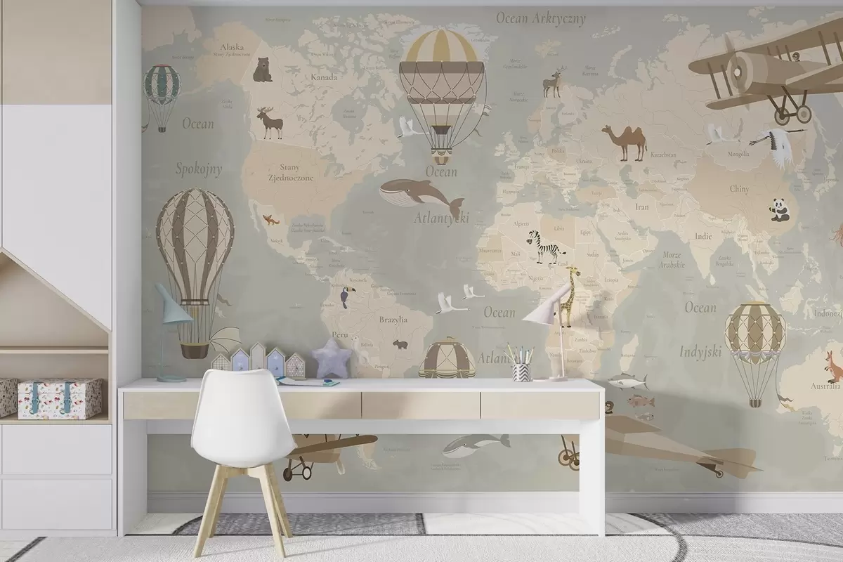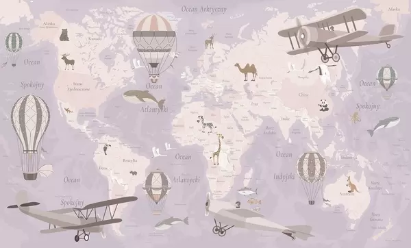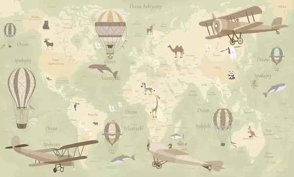 Wall murals Children's world map with animals, airplanes, and hot air balloons. Polish language. Beige color Nr. c00003pl