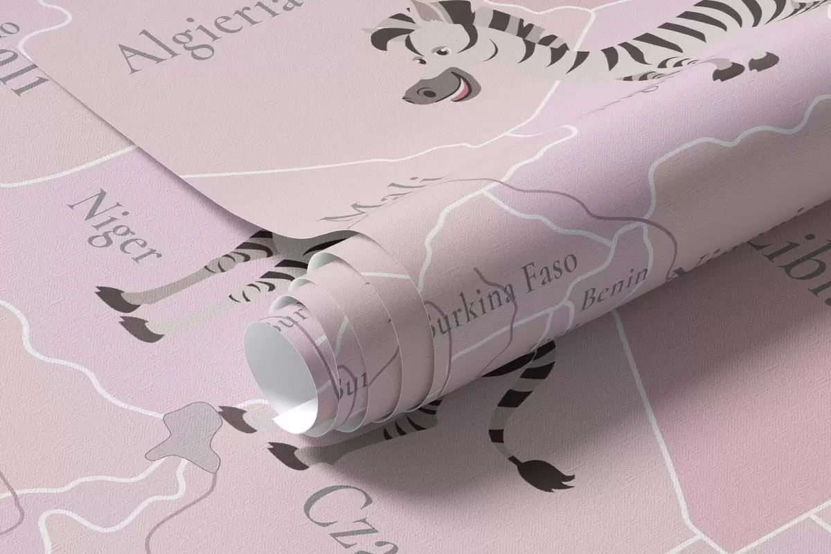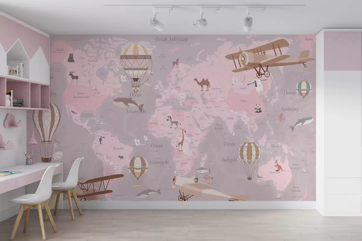 Wall murals Children's world map with animals, airplanes, and hot air balloons. Polish language. Pink color Nr. c00003plv3