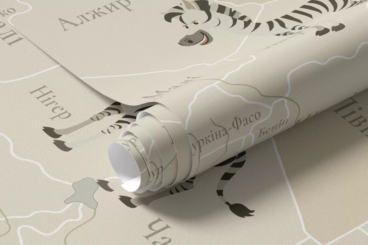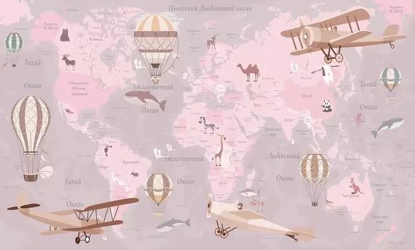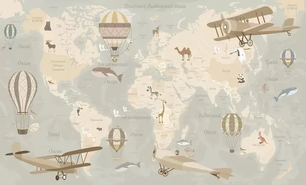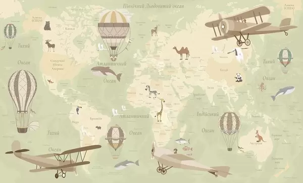 Wall murals Children's world map with animals, airplanes, and hot air balloons. Ukrainian language. Beige color Nr. c00003uk