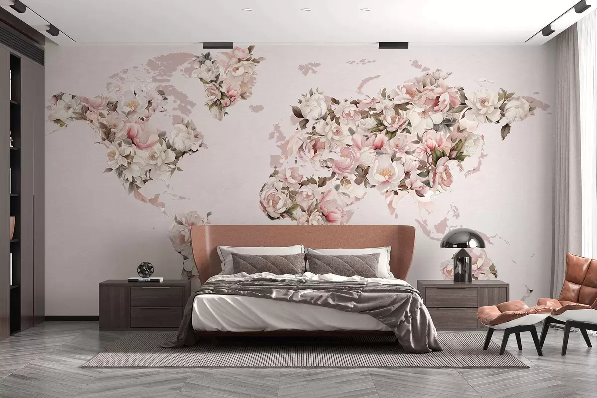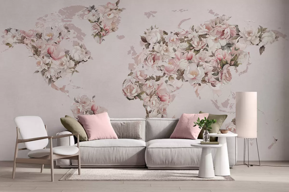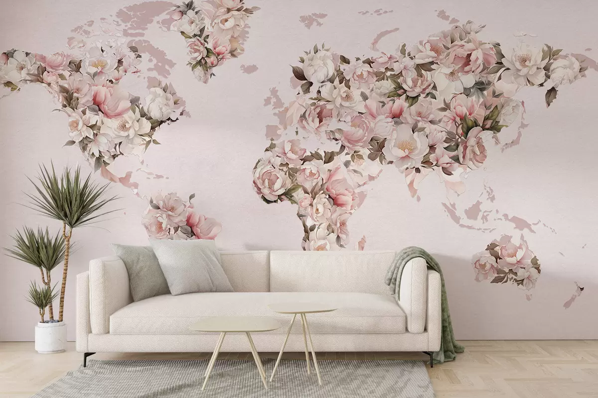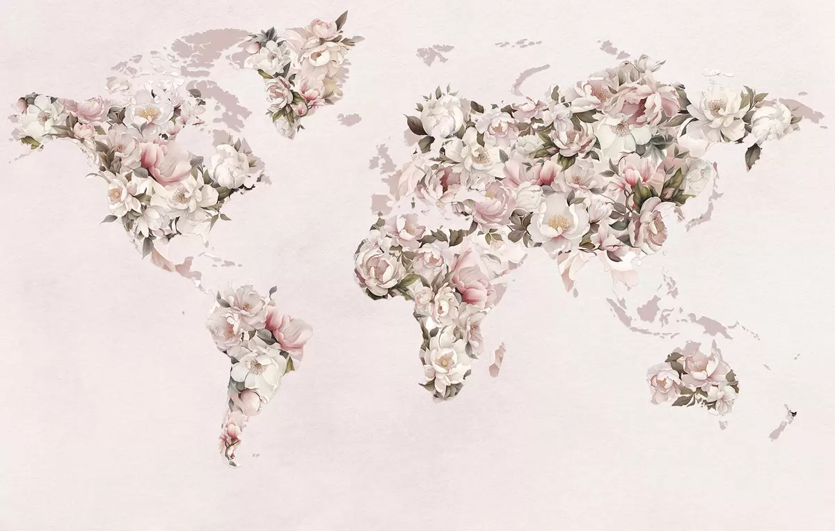 Wall murals A pink world map made of large white and pink peonies Nr. c00005