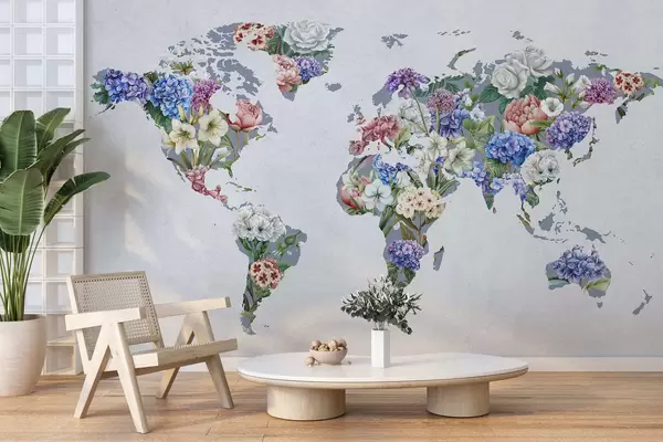 Wall murals A colorful map of the world made from a variety of vibrant flowers Nr. c00006