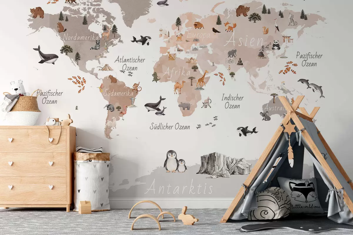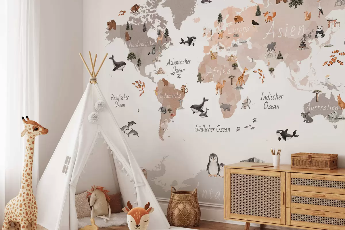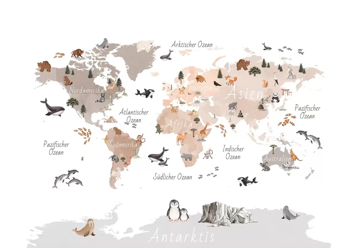 Wall murals A watercolor-style Beige map featuring animals, plants, and architecture. Labels in German Nr. c00009dev3