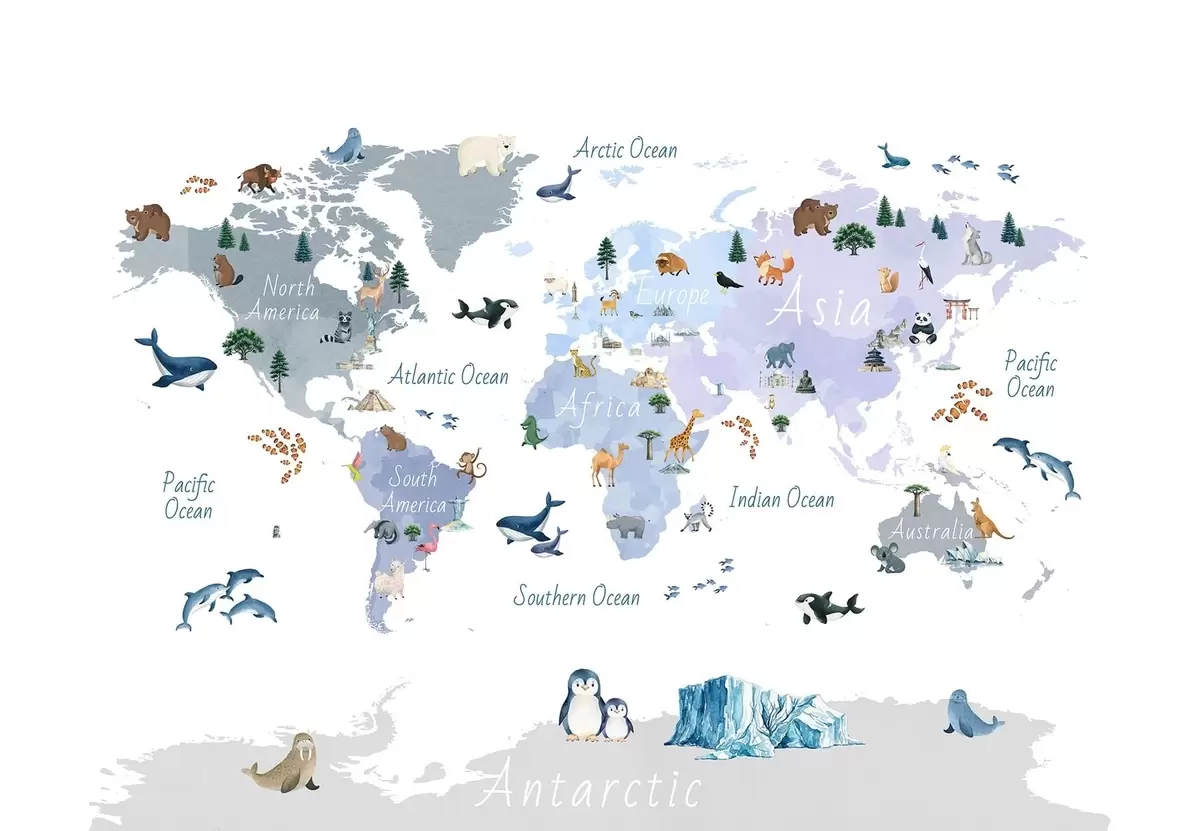 Wall murals A watercolor-style Blue map featuring animals, plants, and architecture. Labels in English Nr. c00009env1