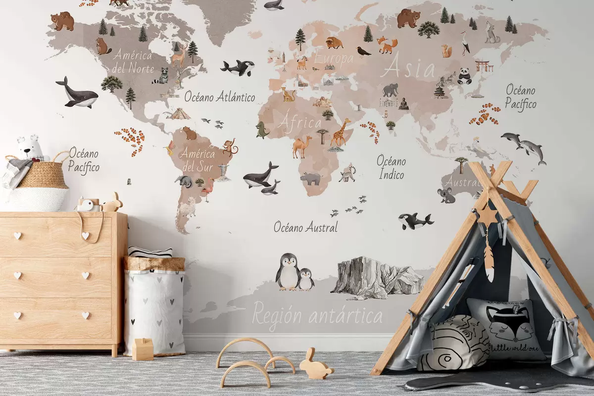 Wall murals A watercolor-style Beige map featuring animals, plants, and architecture. Labels in Spanish Nr. c00009esv3
