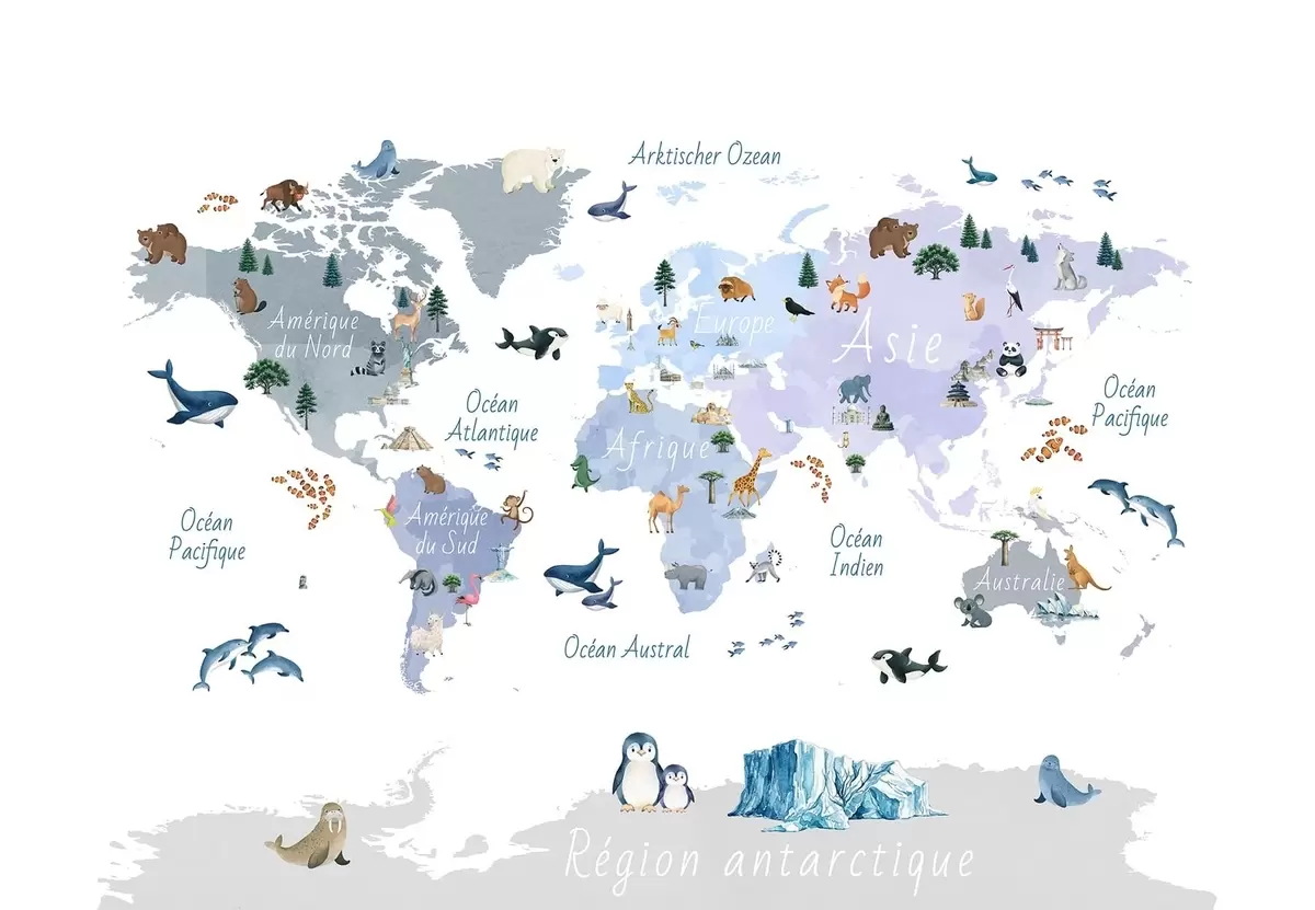 Wall murals A watercolor-style Blue map featuring animals, plants, and architecture. Labels in French Nr. c00009frv1