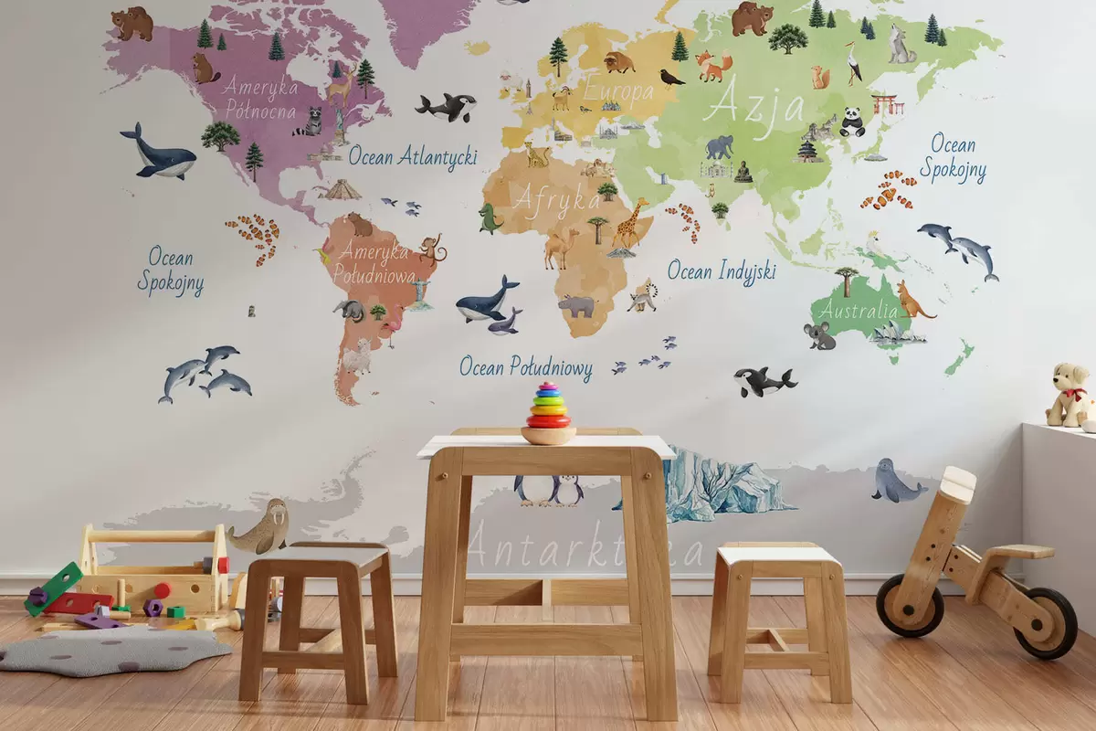 Wall murals A watercolor-style color map featuring animals, plants, and architecture. Labels in Polish Nr. c00009pl