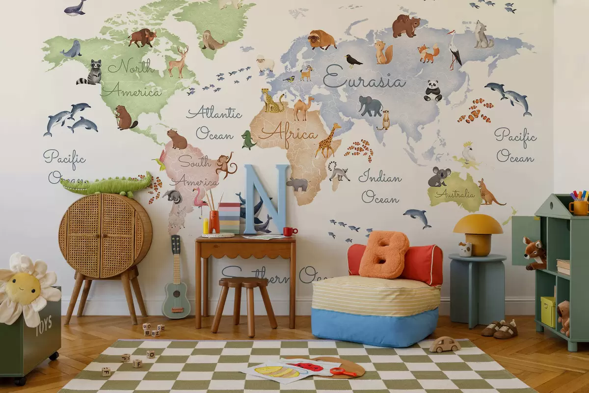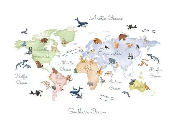 Wall murals A watercolor-style color map featuring animals. Labels in English Nr. c00012en
