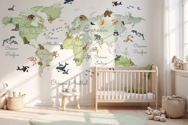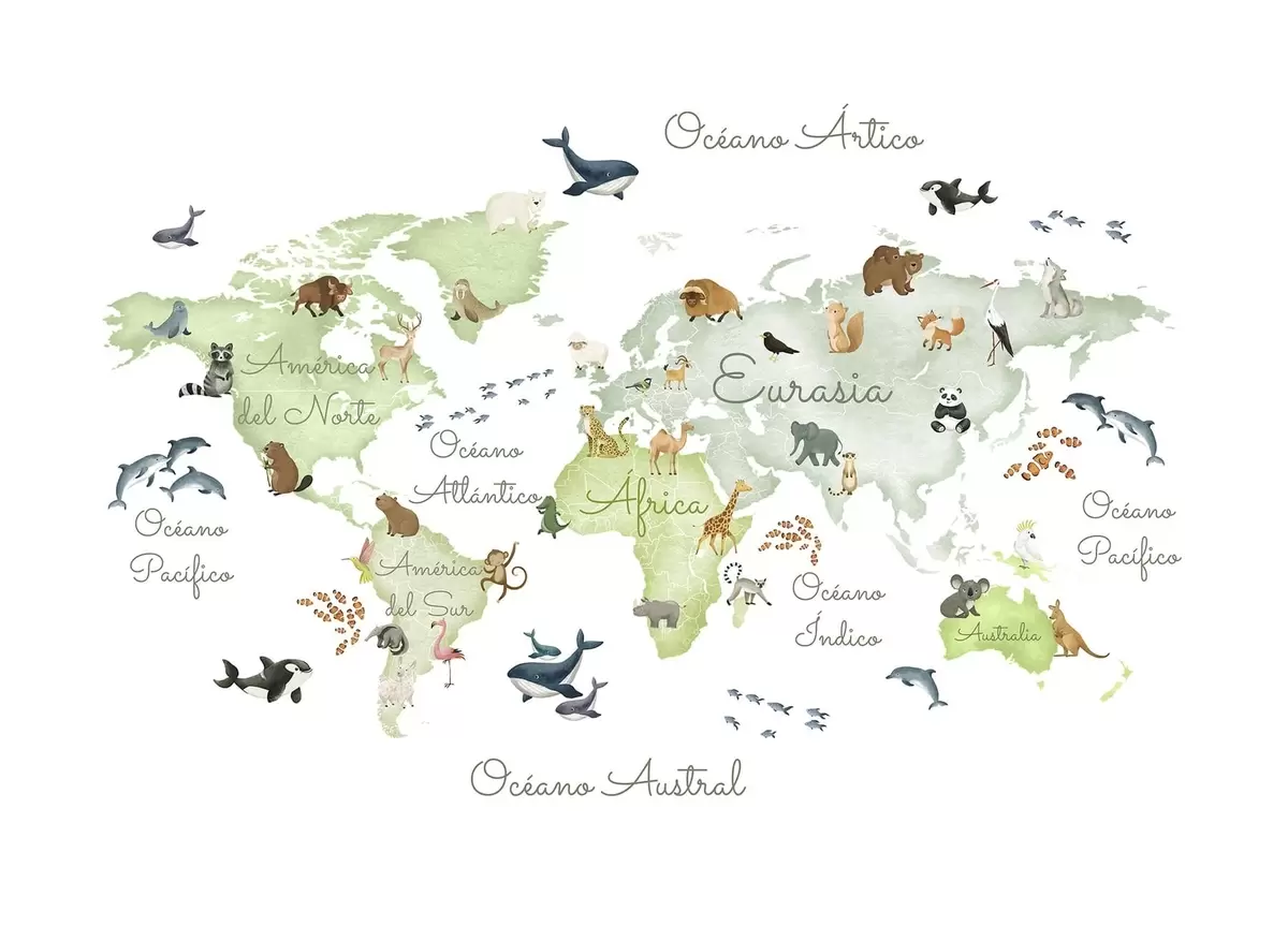 Wall murals A watercolor-style Green map featuring animals. Labels in Spanish Nr. c00012esv2