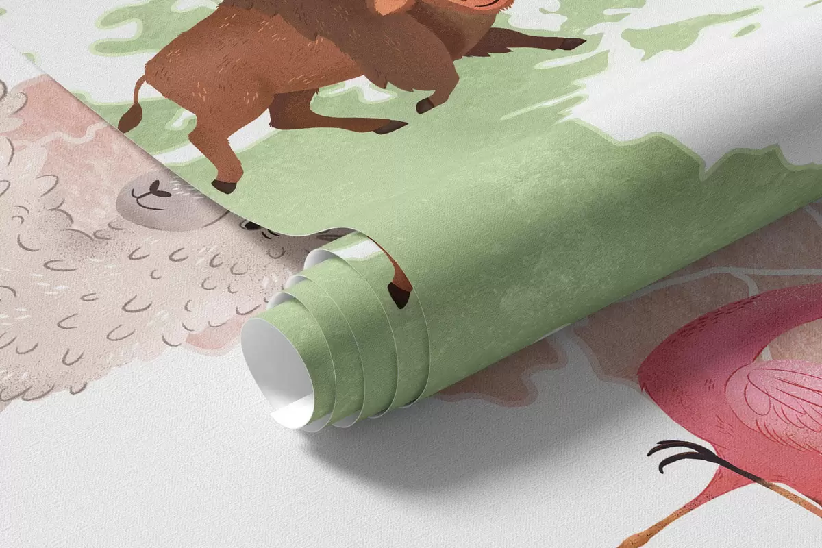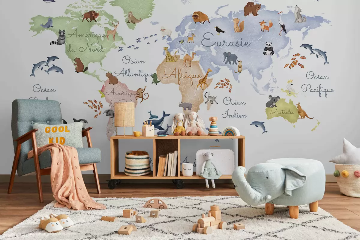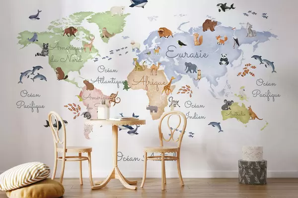 Wall murals A watercolor-style color map featuring animals. Labels in French Nr. c00012fr