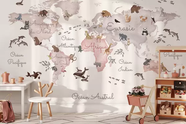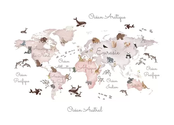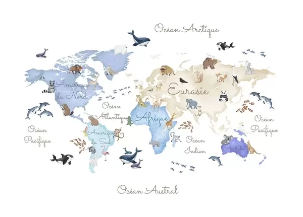 Wall murals A watercolor-style Beige map featuring animals. Labels in French Nr. c00012frv3