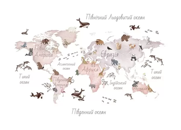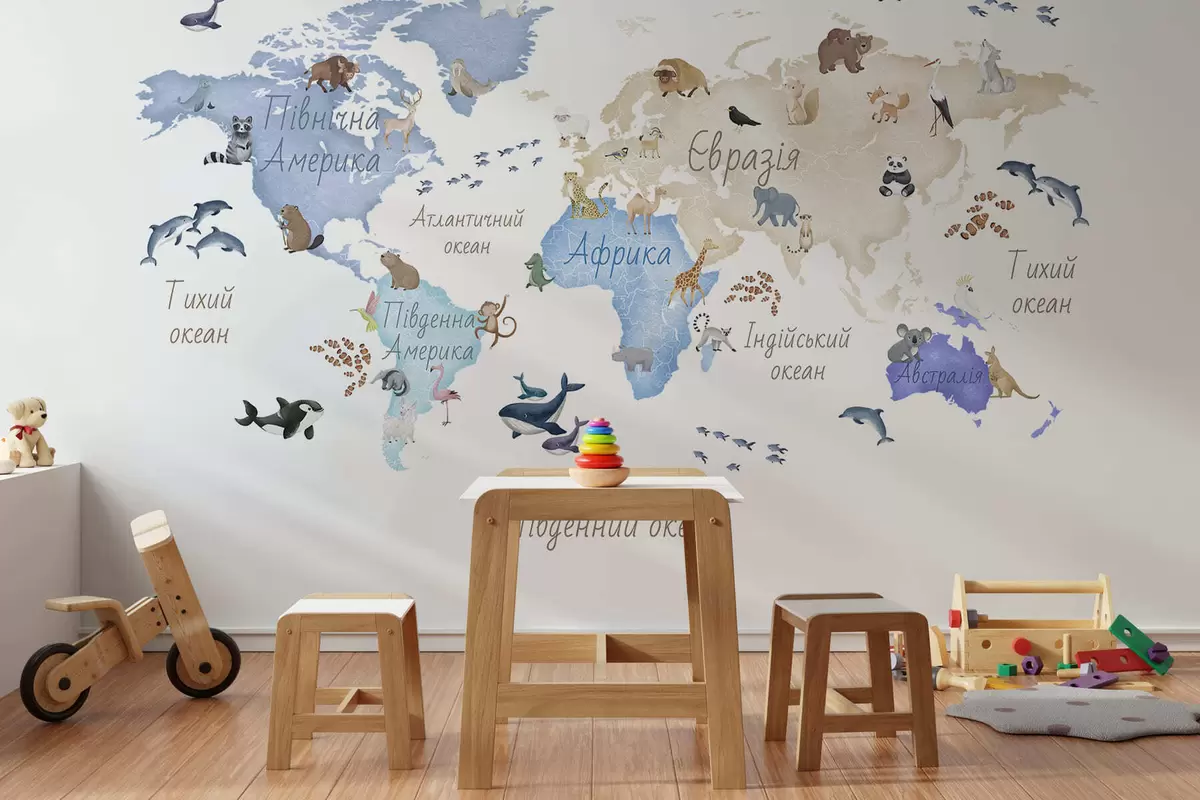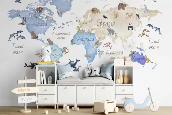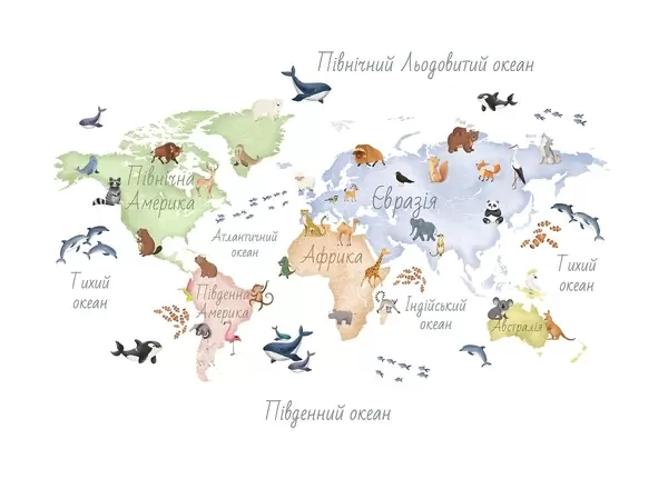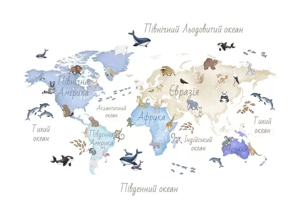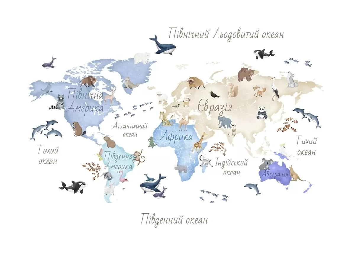 Wall murals A watercolor-style Blue map featuring animals. Labels in Ukrainian Nr. c00012ukv1