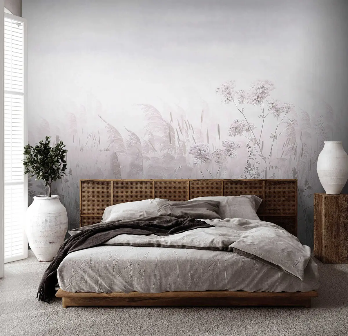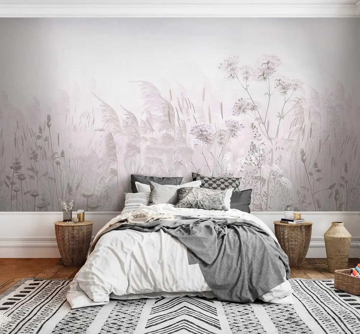 Transforming your living room with the Enchanting Herbs mural brings a serene touch of nature indoors. The soft hues and delicate floral patterns create a tranquil atmosphere, evoking feelings of peace reminiscent of a quiet grassland or meadow. This vintage nature theme enhances the space, inviting warmth and comfort. The mural acts as a soothing backdrop, making the room feel larger and more open while fostering a connection to the external world, perfect for relaxation or gatherings with loved ones.