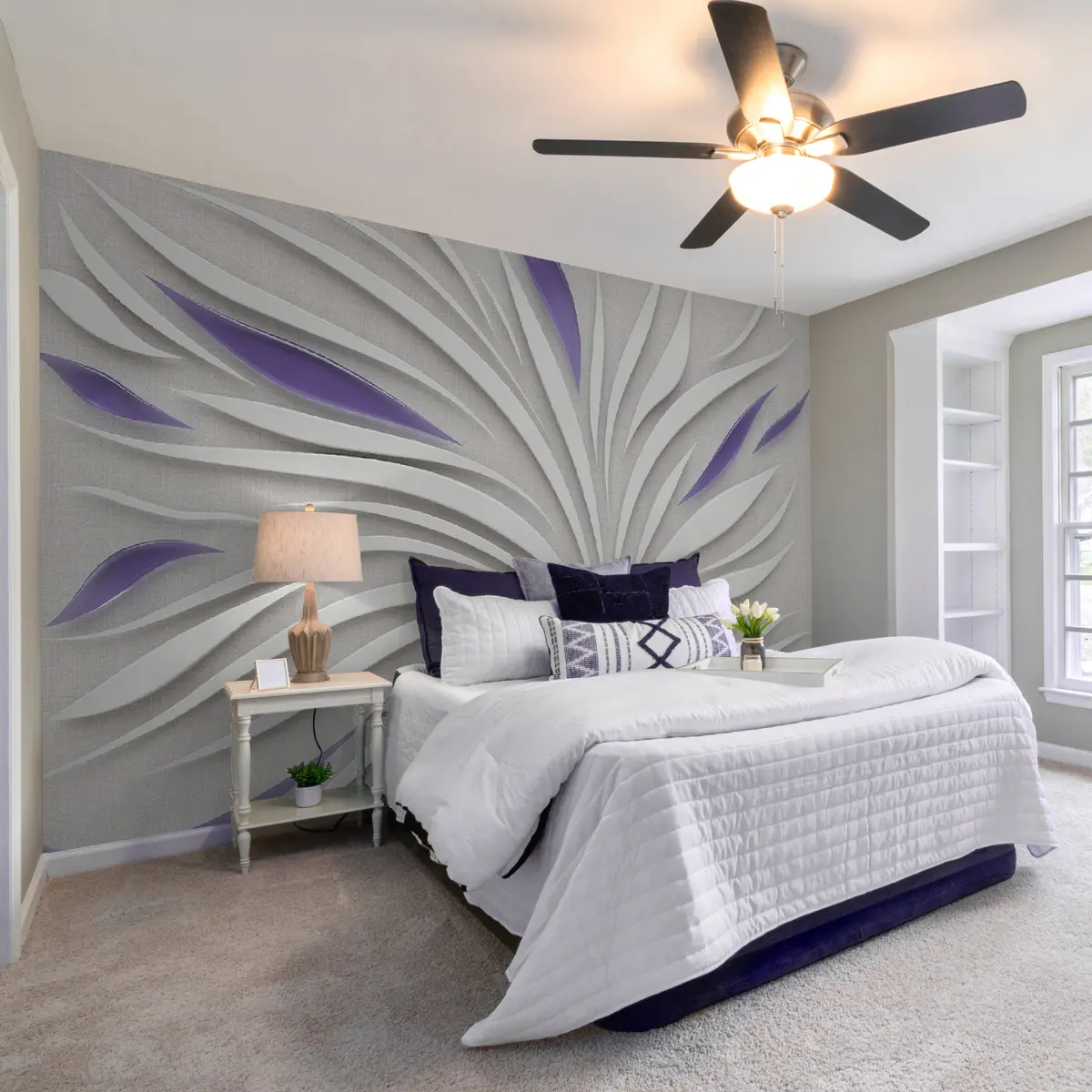 The introduction of the abstract flower wall mural in rich shades of purple revitalizes the living room, creating a captivating focal point. Its radial design adds depth and dimension, enhancing the overall atmosphere with a sense of elegance and tranquility. The embossed textures play with light, subtly drawing attention to the floral motifs, while the delicate color palette harmonizes beautifully with various furnishings. This transformation infuses the space with creativity and warmth, making it an inviting oasis for relaxation and social gatherings.