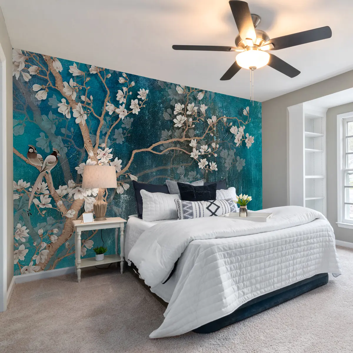 The addition of the wall mural featuring magnolias and cherry blossoms has transformed the living room into a serene oasis. The soft hues of the flowers against the tranquil backdrop create a sense of calm, inviting relaxation and contemplation. Vintage nature elements infuse a timeless charm, while the delicate branches extend gracefully, making the space feel more expansive. This artwork harmonizes beautifully with the room's decor, enhancing its aesthetic appeal and fostering a welcoming atmosphere that connects with nature.