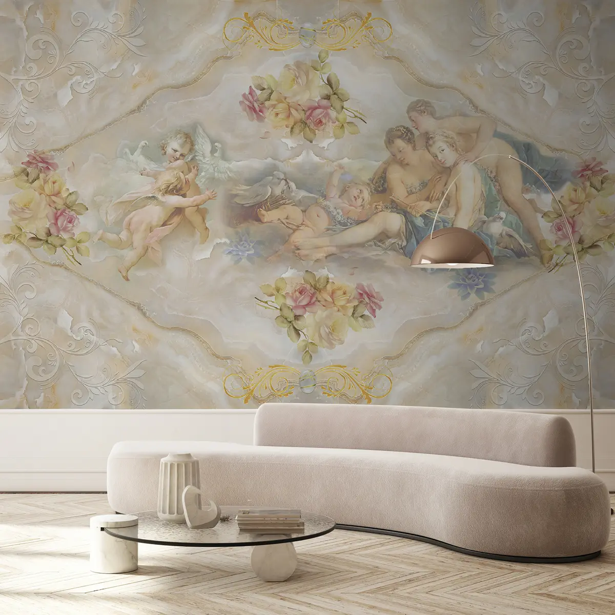 The addition of the wall mural featuring mythical creatures and nature transforms the living room into a captivating sanctuary. The fresco style, enriched with baroque elements, brings a sense of elegance and depth, while the graceful depiction of angels adds a touch of serenity. The soft color palette harmonizes with the natural light, creating an inviting atmosphere. This mural serves as a stunning focal point, inspiring a sense of wonder and making the space feel more spacious and airy, perfect for relaxation and gatherings.