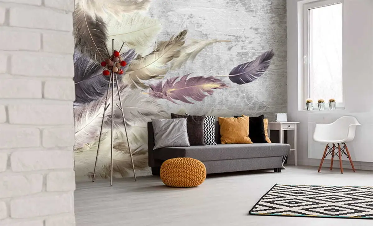 Transforming your living room with Wall Murals Color Feathers on a concrete wall brings a breath of fresh air. The elegant feather pattern adds a soft, vintage touch to the otherwise industrial space, harmonizing beautifully with the loft style. The muted colors create a calming atmosphere, making the room feel more inviting. This art piece effortlessly draws attention and serves as a stunning backdrop for furniture, enhancing the overall aesthetic without overwhelming other decor elements. The mural's natural beauty enriches your home's character.