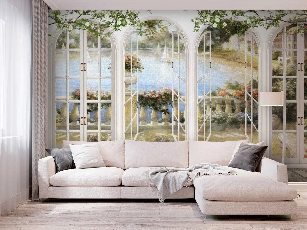 Transforming your living room with Wall murals Paradise corner Nr. U21592 creates a fresh, inviting atmosphere. The mural, depicting a picturesque terrace with vibrant flowers and serene water views, brings the outdoors inside. Light dances through the windows, enhancing the natural beauty of the mural, making the space feel larger and more open. The calming hues and details encourage relaxation and tranquility, perfect for unwinding or entertaining guests. This mural effortlessly elevates your interior, providing a perfect escape in your home.