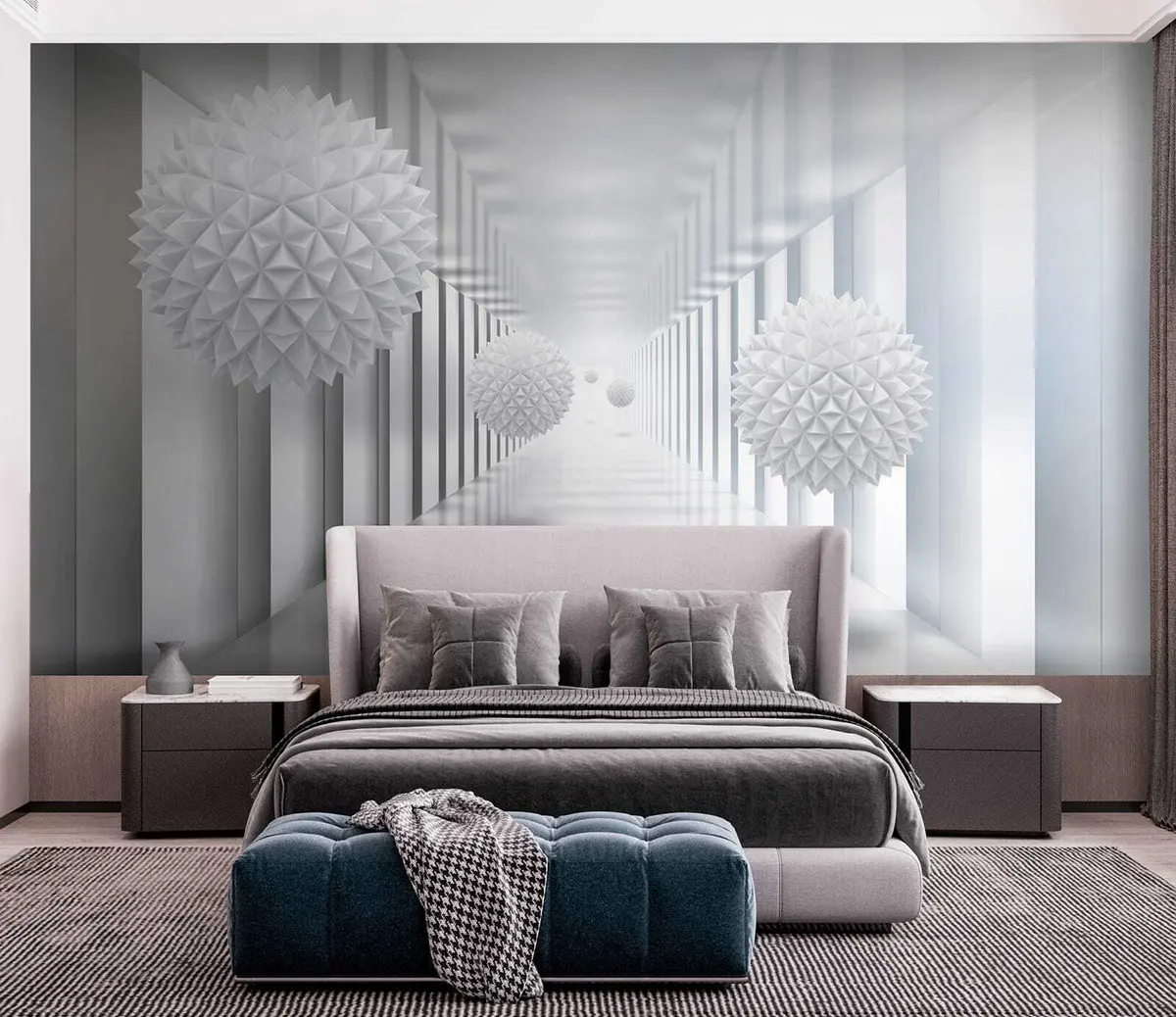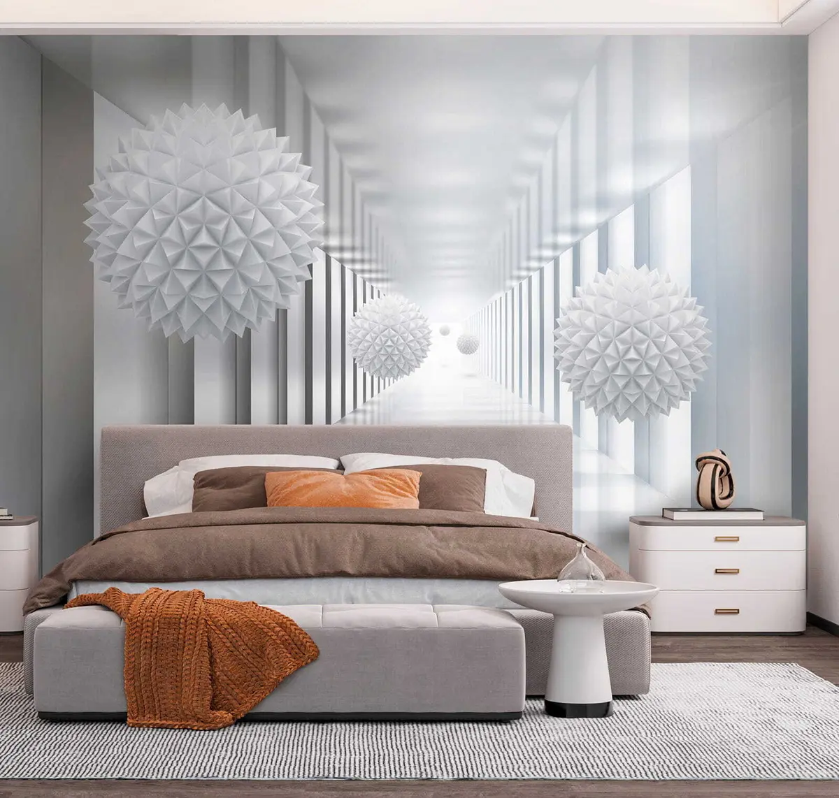 Transforming your living room with the Wall murals Balls design creates an illusion of depth and space. The tunnel effect draws the eye, making the room feel larger and more inviting. The spherical elements add a modern touch, enhancing the overall aesthetic with their geometric forms. This 3D design infuses the space with energy, promoting a sense of movement and dynamic flow. The clean lines and light colors contribute to a tranquil atmosphere, perfect for relaxation and socializing. Overall, it elevates the interior with a stylish, contemporary flair.