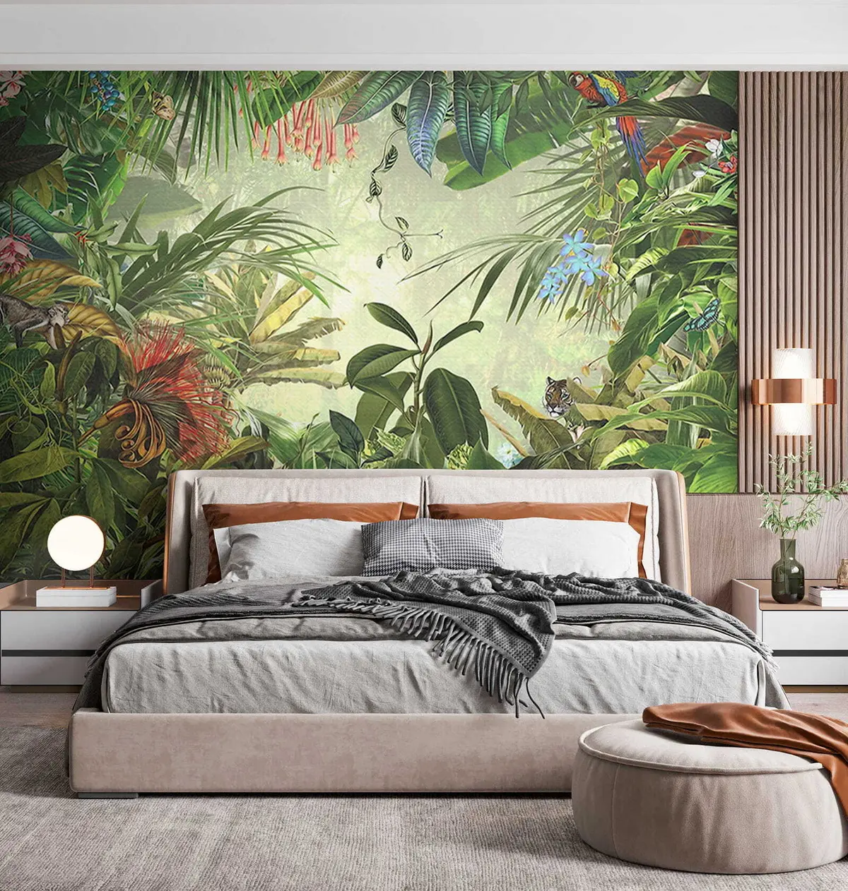 Adding the Wall Murals Tropical Leaves Nr. u29981 to your living room transforms the space into a vibrant jungle oasis. The lush greenery and intricate details of tropical trees create a refreshing atmosphere that brings the outdoors inside. Flora and fauna motifs inspire a sense of adventure, making the room feel alive and inviting. This beautiful backdrop fosters relaxation and encourages exploration, enhancing both the aesthetic and ambiance of your home. Enjoy the natural vibe that connects you with nature every day.