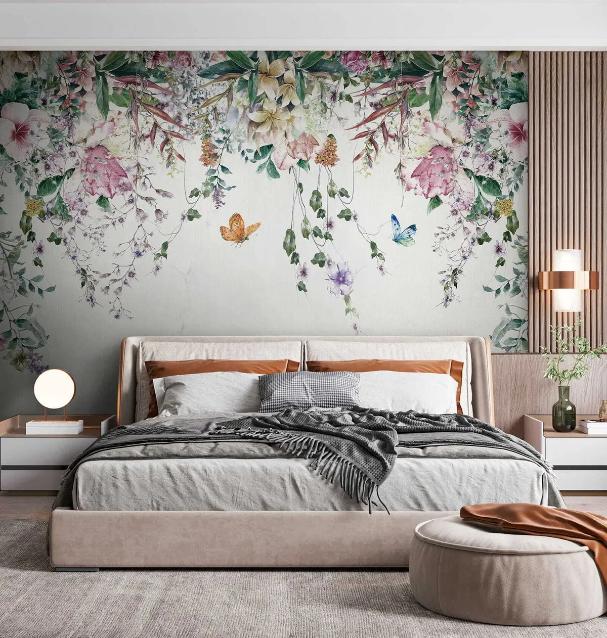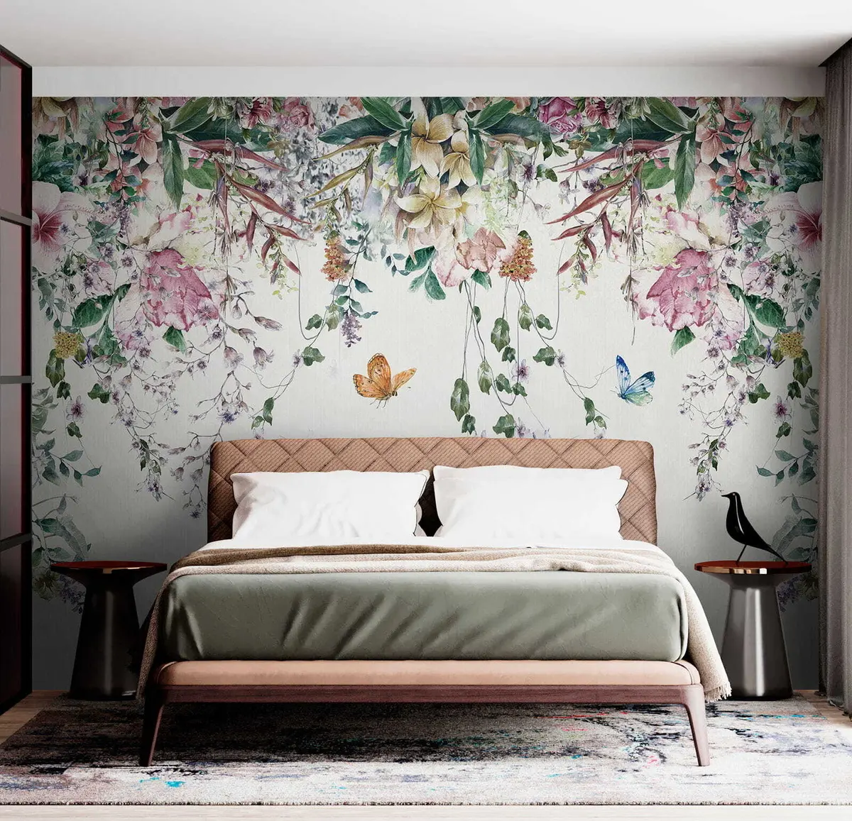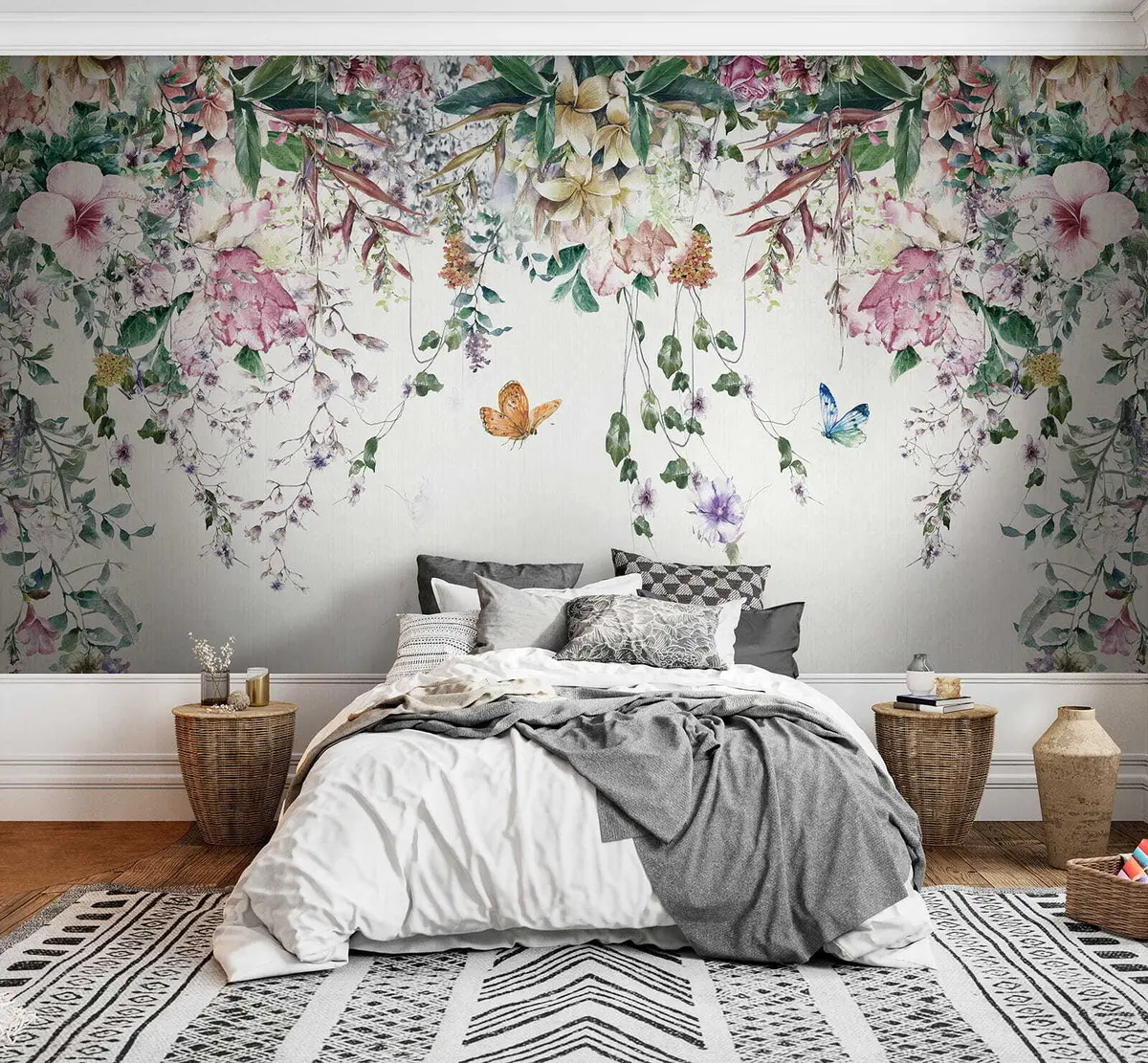 Transforming your living room with the Exotic flowers and butterflies wall mural brings a refreshing vibrancy and a touch of botanical elegance to the space. The intricate floral designs intertwine beautifully, creating a serene atmosphere that promotes a sense of tranquility. Lush colors evoke the charm of vintage nature, inviting warmth and life into the room. This botanical art serves as a captivating focal point, encouraging relaxation while enhancing the overall aesthetic of your home. The result is a harmonious blend of nature and artistry that captivates the senses.