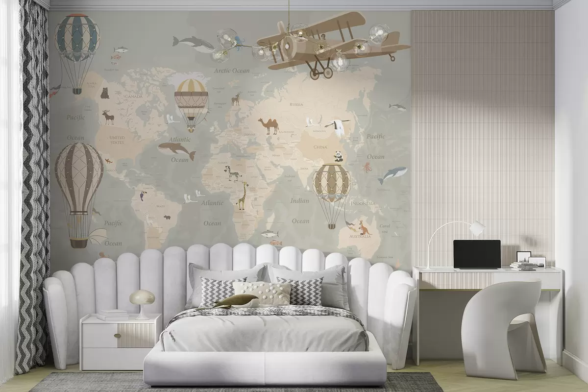 The addition of the Wall mural Map with pictures Nr. u36066d1 has transformed the living room into an inviting and lively space. The beige background complements the overall decor, creating a warm and comfortable atmosphere. The playful visuals of balloons and animals spark curiosity and imagination, making it a perfect fit for kids. This mural not only serves as a beautiful piece of art but also encourages exploration of the world, enhancing both aesthetics and educational value in the room.