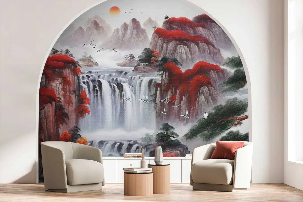 The addition of the Japanese-style waterfall mural transforms the living room into an inviting oasis. The serene imagery of cascading water and lush landscapes creates a calming atmosphere, enhancing relaxation. Vibrant colors of red foliage contrast beautifully with the soft hues of the water, adding visual warmth. This artwork reinforces a connection to nature and introduces a zen-like quality to the space. The mural serves as a stunning focal point, inspiring tranquility and offering a sophisticated oriental touch to the overall decor.
