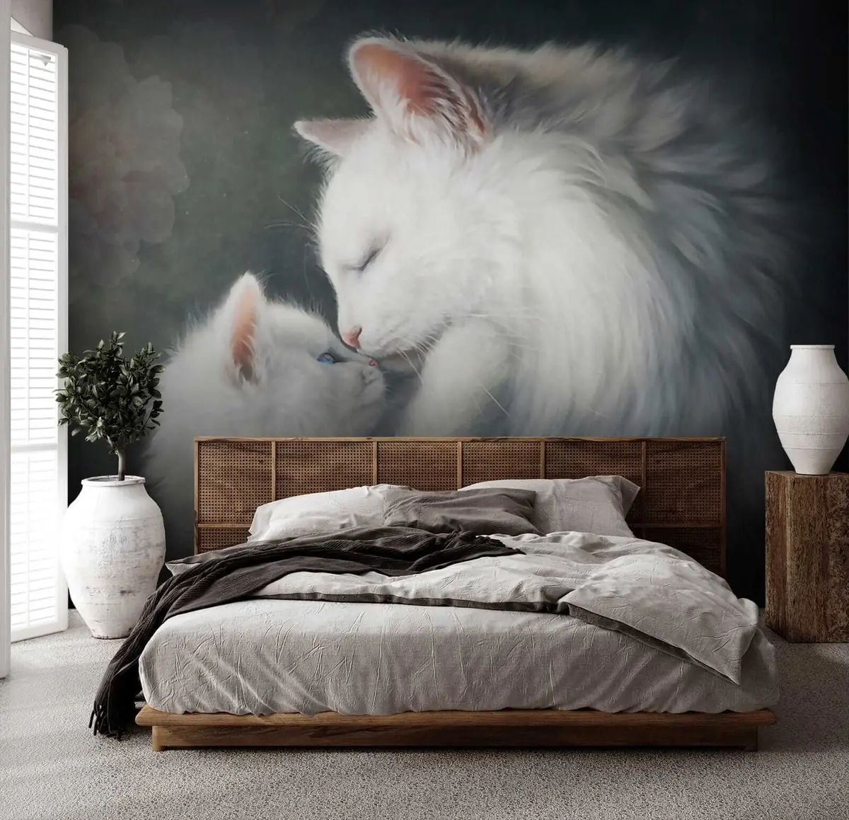Adding the mural of a mother cat and her kitten to the living room wall has transformed the space into a cozy haven. The artwork brings warmth and a touch of playfulness, as the soft colors and loving expressions of the cats evoke feelings of comfort and joy. This enchanting scene draws the eye, creating a focal point that encourages relaxation and conversation. The charm of the kitten and kitty creates an inviting atmosphere, making the room feel livelier and more engaging for family and guests alike.