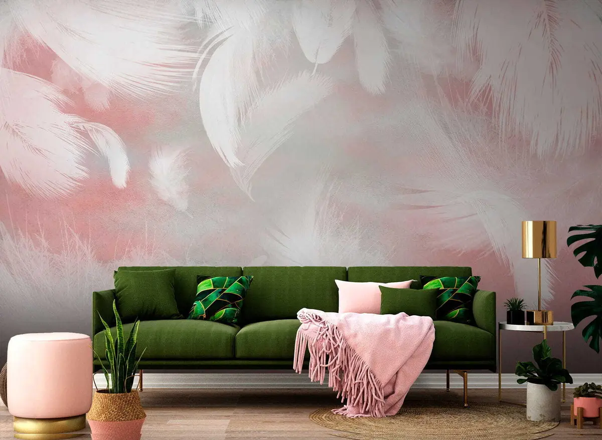 Transforming the living room with the pink cloud mural has created a serene and inviting atmosphere. The delicate hues bring a sense of calmness, inviting relaxation and creativity. The feather motif adds a touch of whimsy and softness, making the space feel airy and ethereal. This elegant backdrop complements the décor beautifully, enhancing natural light and creating an open, spacious feel. Overall, the mural has elevated the interior, making it a delightful sanctuary for both entertaining and unwinding.