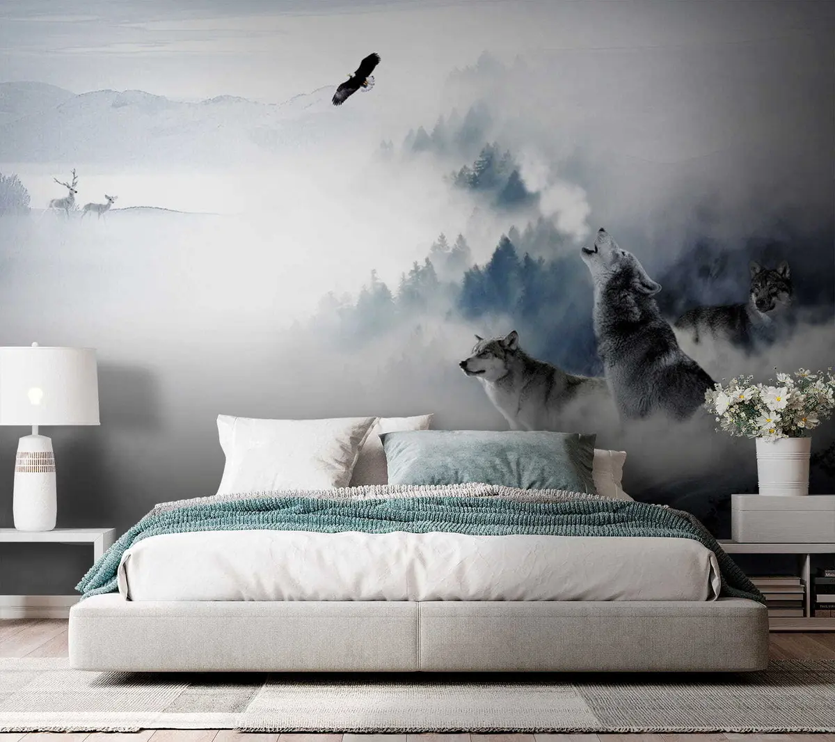 The addition of the Wall mural featuring wolves in a tranquil forest brings a sense of depth and serenity to the living room. The ethereal landscape evokes a connection to nature, enhancing the ambiance with its calming imagery. The wolves, depicted in their natural habitat, introduce an element of wildness that sparks curiosity and admiration. This mural also serves as a focal point, encouraging viewers to reflect on themes of solitude and companionship in the wilderness, creating a space that feels both inviting and introspective.
