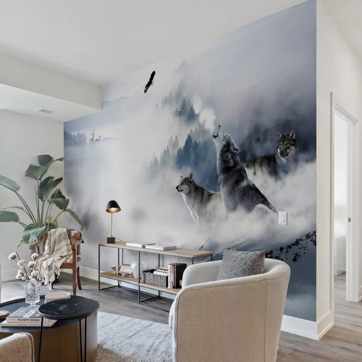 The addition of the Wall mural featuring wolves in a tranquil forest brings a sense of depth and serenity to the living room. The ethereal landscape evokes a connection to nature, enhancing the ambiance with its calming imagery. The wolves, depicted in their natural habitat, introduce an element of wildness that sparks curiosity and admiration. This mural also serves as a focal point, encouraging viewers to reflect on themes of solitude and companionship in the wilderness, creating a space that feels both inviting and introspective.