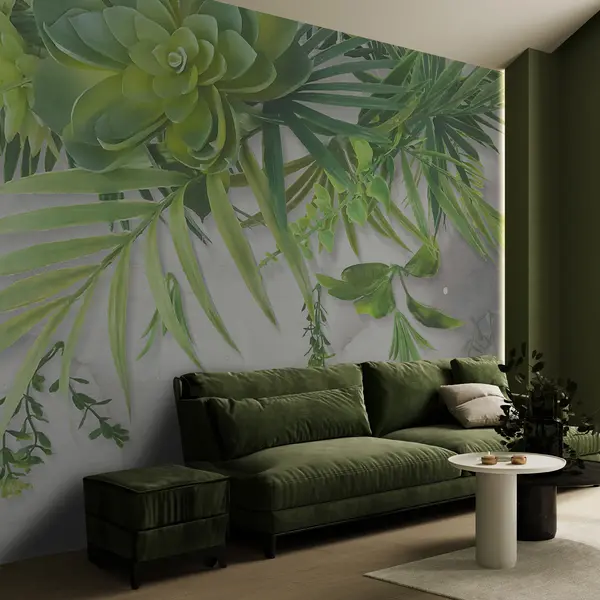 Transforming your living room with the wall mural featuring 3D leaves and evergreen plants instantly elevates the space. The botanical art integrates nature’s serenity into your home, creating a refreshing atmosphere. The vibrant greens of the plants provide a calming visual contrast that brightens the room, making it feel more inviting. This design not only enhances the aesthetics but also promotes a sense of tranquility, perfect for relaxation or gatherings. The mural beautifully connects indoor and outdoor elements, enriching the overall ambiance.