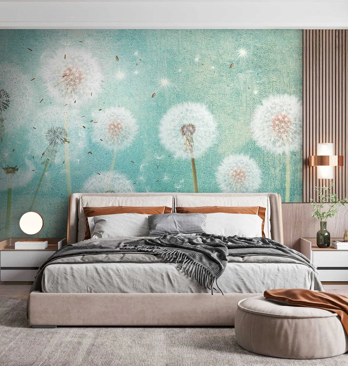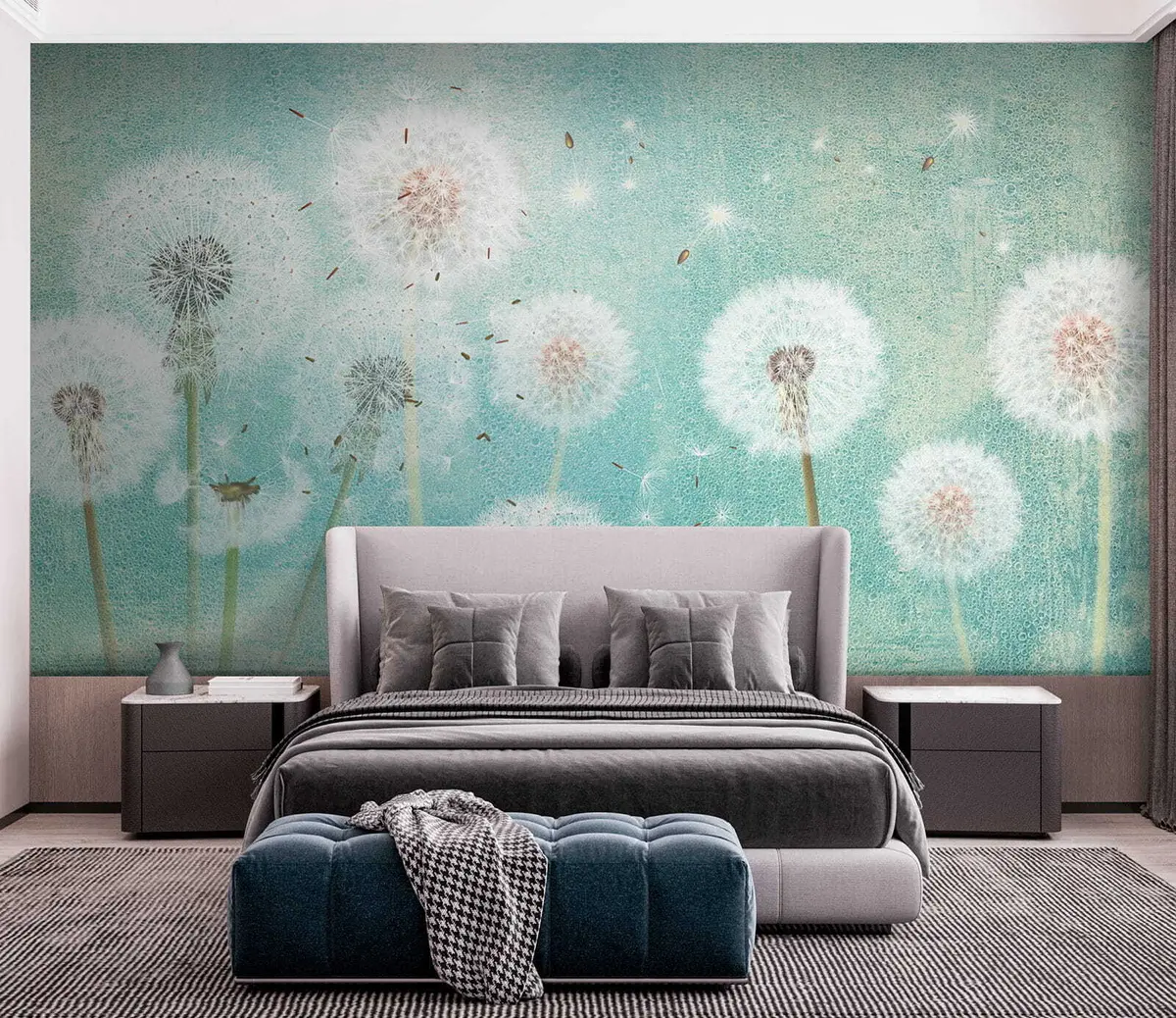 After adding the cute dandelion mural to your living room, the space transforms into a serene oasis. The soft hues of blue and white create a calming atmosphere, evoking feelings of nature and tranquility. The vintage nature of the design brings a touch of nostalgia, making the room feel warm and inviting. The dandelions seem to dance on the wall, infusing the environment with a light-hearted charm. This mural not only enhances the aesthetics but also encourages relaxation and a connection to the outdoors, enriching your living experience.