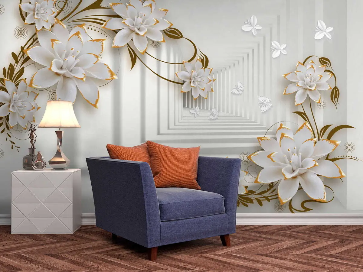 Transforming your living room with the wall mural featuring 3D flowers and butterflies creates a vibrant, enchanting atmosphere. The large flowers, intricately designed, bring a sense of depth and dimension, making the space feel more expansive. This mural enhances natural light, giving the room a warm, inviting glow. The delicate butterflies add a whimsical touch, promoting a feeling of tranquility. Overall, this design elevates the aesthetic, providing a refreshing, lively backdrop that breathes new life into your living area.
