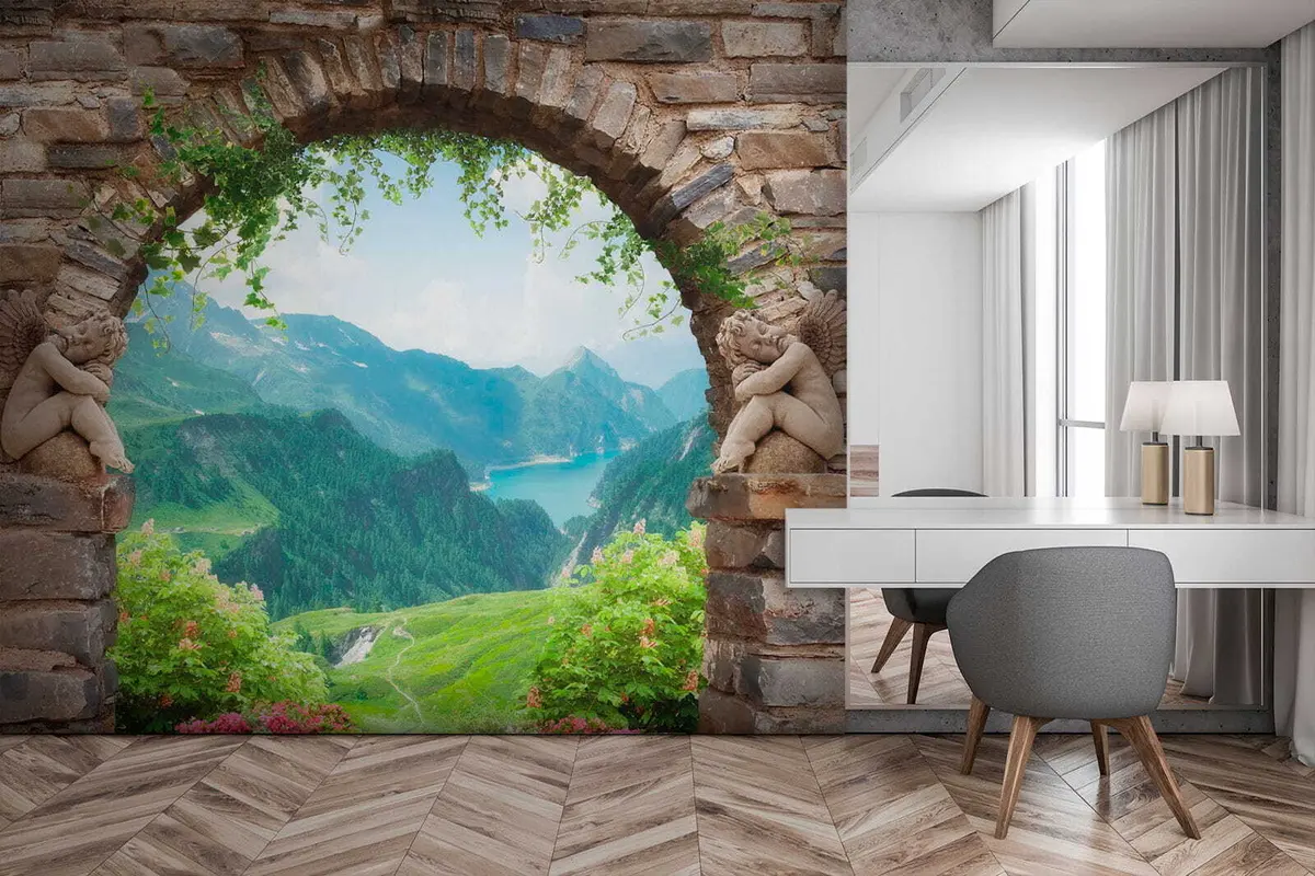 Transforming your living room with the Wall Murals Arch featuring a mountain view brings a refreshing ambiance to the space. The vintage nature of the mural evokes a serene garden setting, making it feel like a peaceful retreat. The stunning Italian-inspired landscape invites relaxation and inspires conversation, creating an inviting atmosphere. This mural creates an illusion of depth and opens the room to the beauty of nature, fostering a harmonious connection between the indoors and the outside world.