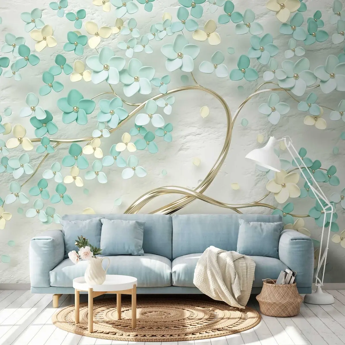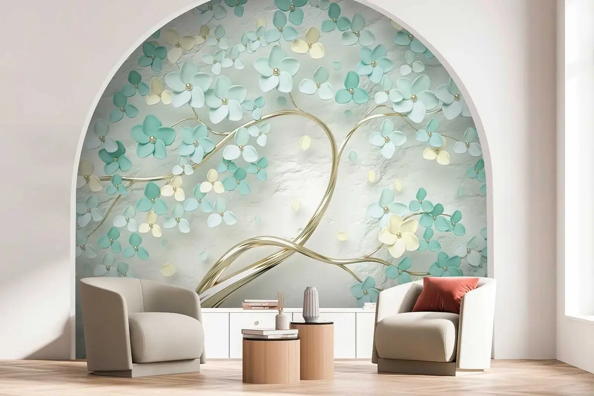 Transforming your living room with the Wall murals Plant, flower and leaf Nr. u52550 brings a refreshing and vibrant atmosphere. The delicate design of 3D flowers and foliage creates a sense of depth and liveliness. The soft hues of turquoise and cream harmonize beautifully, enhancing the room's tranquility. This mural not only captivates attention but also evokes a connection to nature, making the space feel more inviting and serene. It’s an ideal backdrop for relaxation and social gatherings, adding a unique charm to your decor.